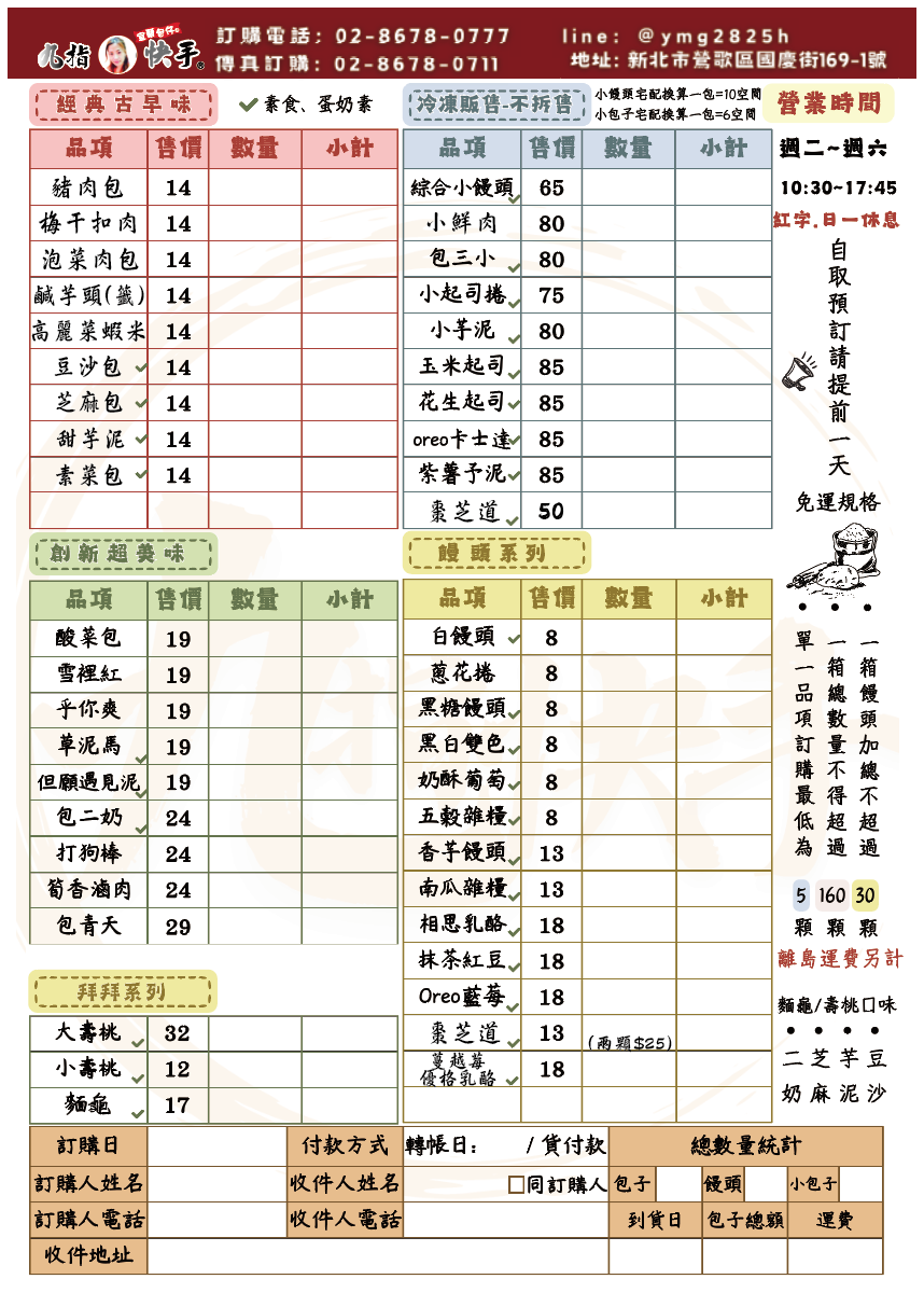 – 訂購時最低請以5為一個最小單位,自取須提前一天訂購, 宅配可下載此菜單並進行填寫,以傳真或官方的LINE進行訂購。 若訂單上面有任何問題,我們將會聯繫您。 (有打勾的菜單為目前發放的菜單) (但因為後續有新增口味,小編也有整理出一份菜單供應給您參考)